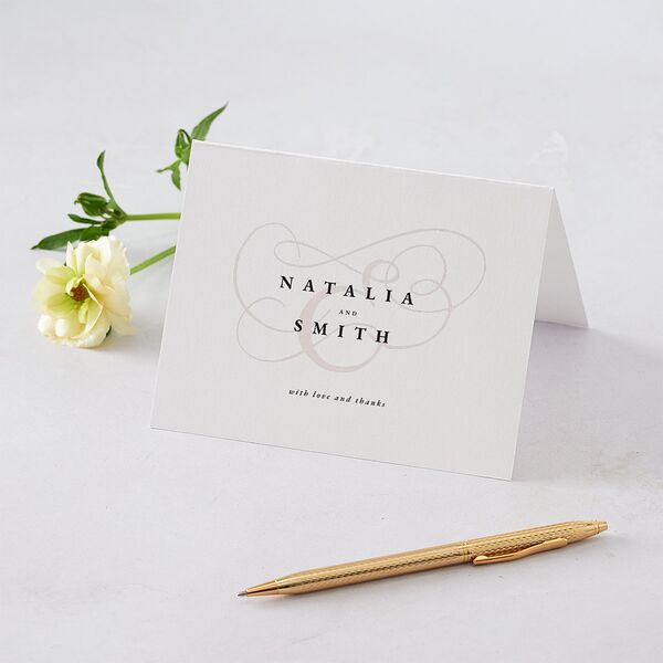 These elegant folded thank-you cards feature an ornate ampersand design, with your names and thank-you message displayed in looping and serif fonts at the center. These personalized thank-you cards will complement the sophisticated flourish of your invitation suite and come in a variety of light and dark color options.