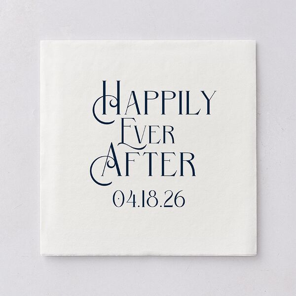 The timeless words that close every fairytale now take center stage at your wedding celebration, elegantly displayed on your luncheon napkins. Rendered in swooping serif typography, this message of joy captures the pure elation of your union. These words are beautifully complemented by your wedding date for a flourishing finish.