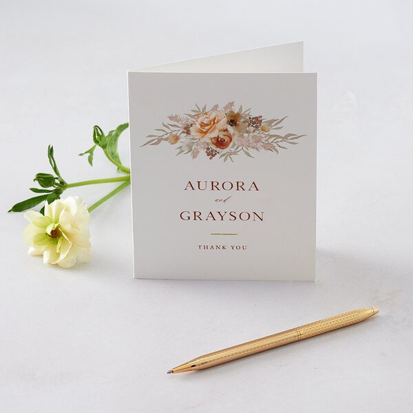 On the front of your thank-you cards, your names and details appear in serif font under a charming garland of bohemian florals. Glimmering foil detailing also appears on the front of the cards. The inside is blank for your custom message.