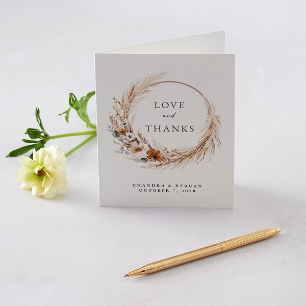This elegant thank-you card features a bohemian hoop wrapped in pampas grass against a solid block of light or dark color. The words 'Love and Thanks' appear at the center in classic serif font. Your names are inscribed along the bottom alongside your wedding date, lending this thank-you card a personalized touch.