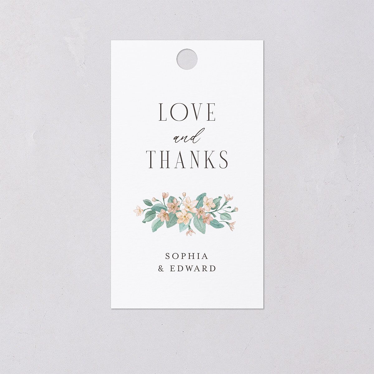 A romantic illustration of Massachusetts' state flower, the mayflower, adorns these favor gift tags. A sophisticated serif font, accented with a touch of calligraphy, highlights your “love and thanks,” while the back features your chosen accent color.