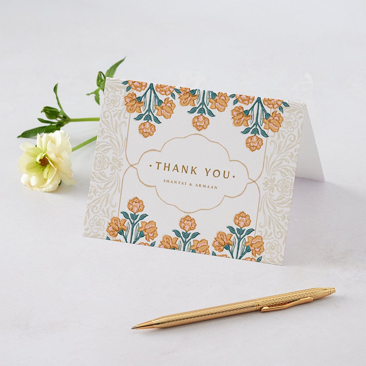Show your wedding guests your gratitude with this vibrant thank-you card. A stylish and colorful botanical design is displayed along the top and bottom, with your names and thank-you message outlined in the center.