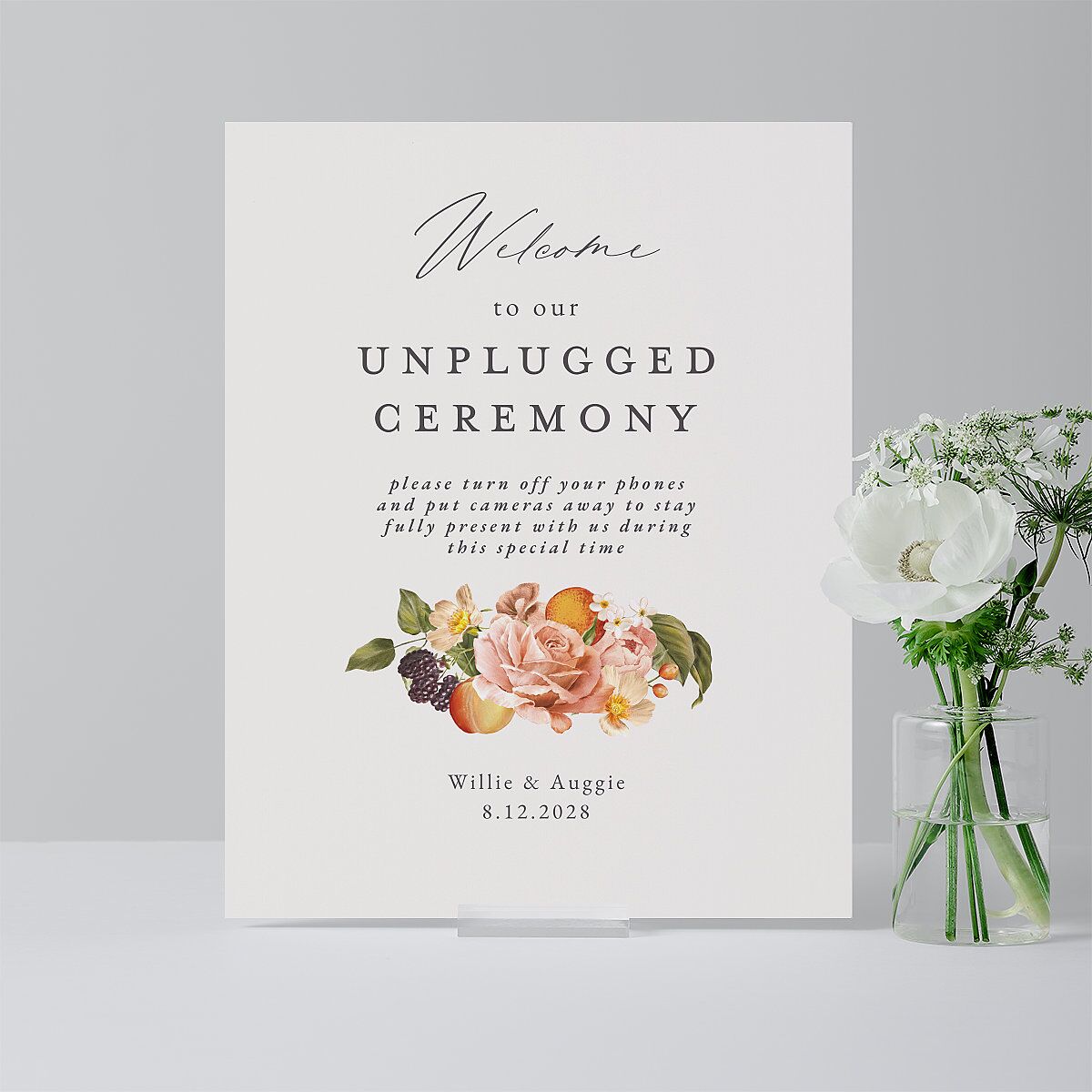These typography-only tabletop signs effortlessly share heartfelt messages with your guests throughout the ceremony and reception. Designed for tabletop display, each piece showcases a thoughtful blend of serif, handwritten, and italic type.