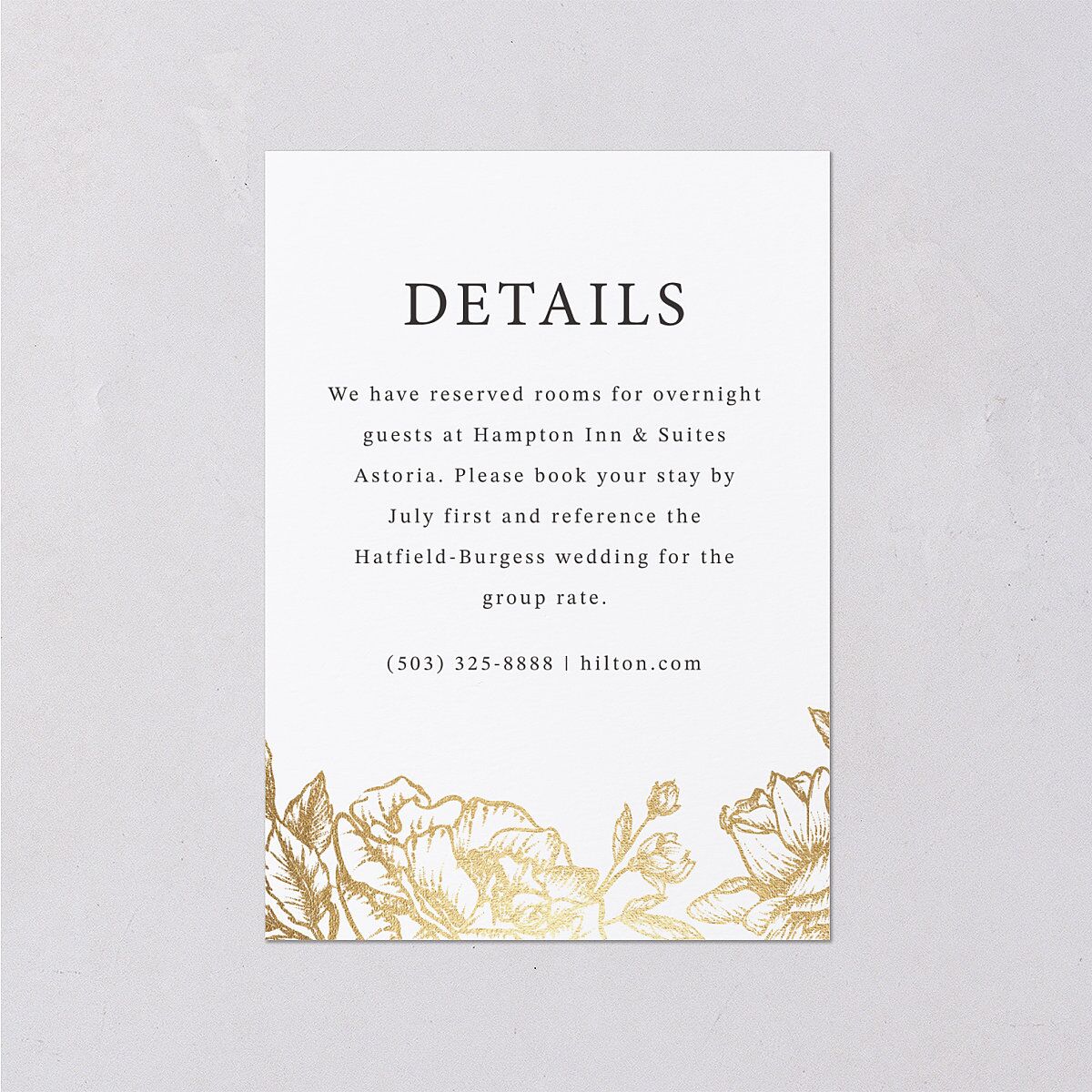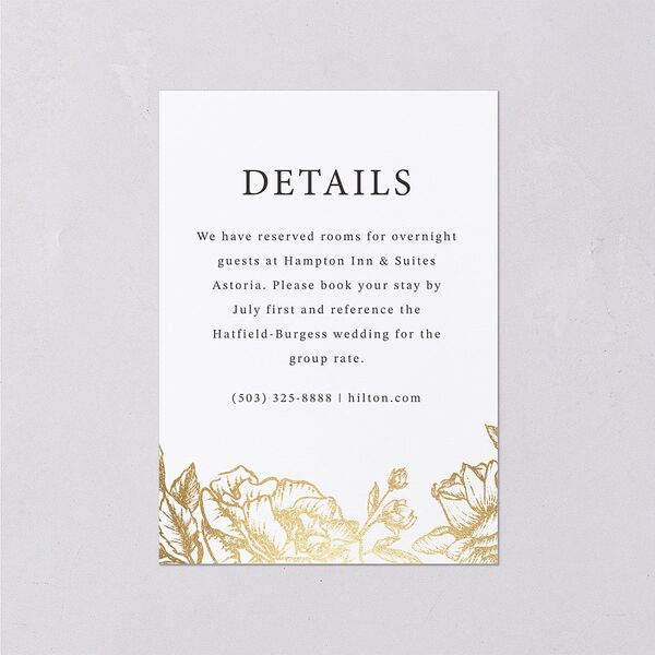 Hand-drawn florals thrive in a metallic garden along the base of our enclosure cards. Must-know details appear in carefully printed lettering above the scenic foil-kissed artwork. Guests can find out more details about your upcoming celebration on the back by scanning the included QR code.