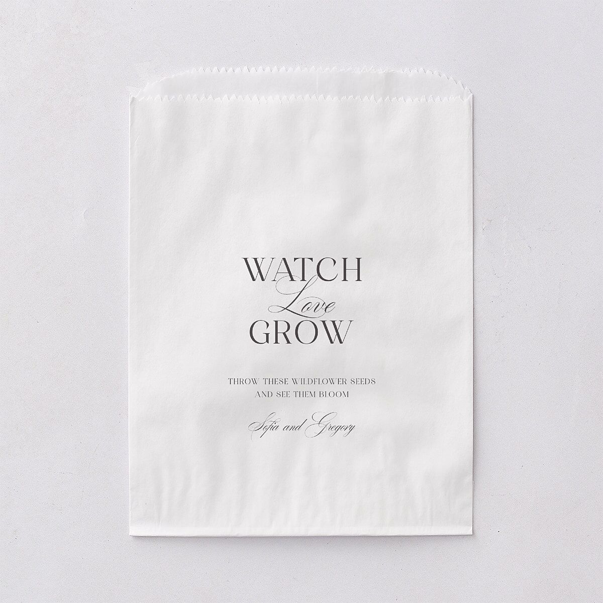 Invite your loved ones to cultivate new growth with these thoughtful day after favor bags. Featuring a heartwarming blend of serif and flowing calligraphy, each bag encourages guests to scatter the wildflower seeds inside, watching as life blooms from their planting. Your names appear at the bottom in a vintage-style handwritten font, adding an effortlessly elegant touch.