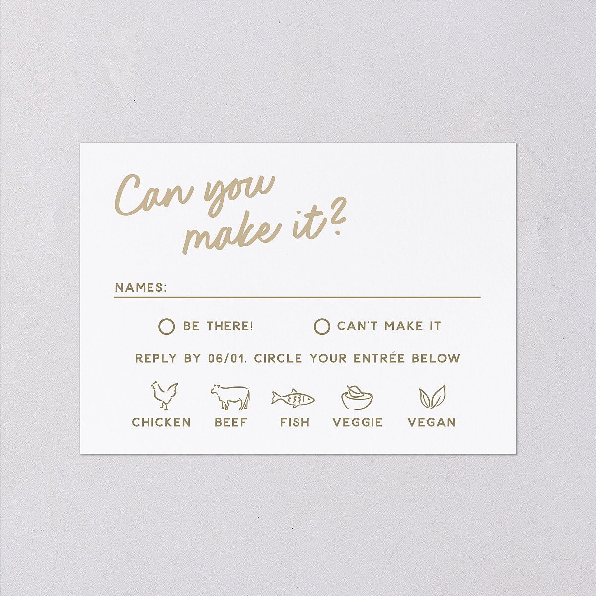 These playful response cards pair bold, handwritten-style script with clean sans serif lettering, while quirky food icons make meal selections fun and easy. Flip them over to find a friendly headline and a scannable QR code that keeps the RSVP experience simple and quick.