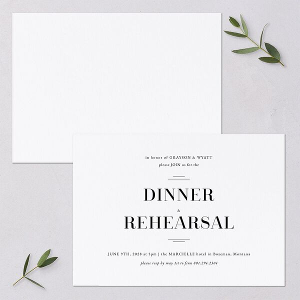 A rehearsal dinner invitation is a classic way to ease guests into festivities. The front of these cards shows the first names of the couple, the words "Dinner & rehearsal," and the details of the event.