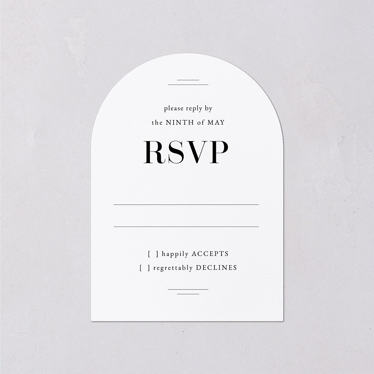 The front of each of these wedding response cards are bracketed by paired lines at the top and bottom. Between these are the respond-by date, the word "RSVP," and space for a response. The back shows a selection of entrees, also bracketed by paired lines.
