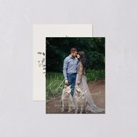 With this petite save the date, your guests are invited to mark their calendars with beautiful cursive and timeless serif fonts. Upon your chosen image, your names, wedding date, and location will be displayed while curved garlands grace the back.