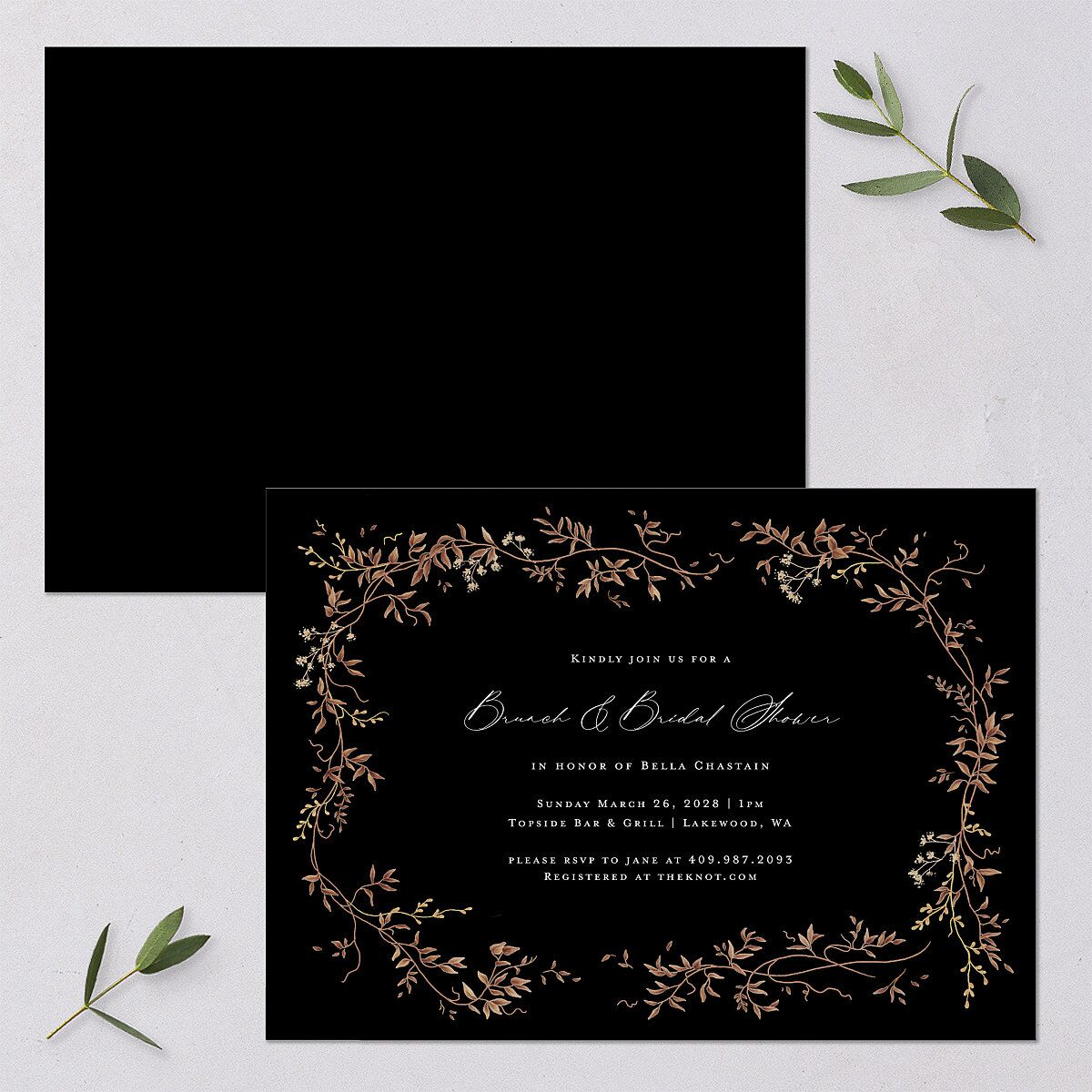 Invite your guests to a fairytale affair with these dainty, botanical bridal shower invitations. In the center, your event information is displayed in elegant script and classic uppercase serif font. A gentle frame of enchanting vines ties the design together.