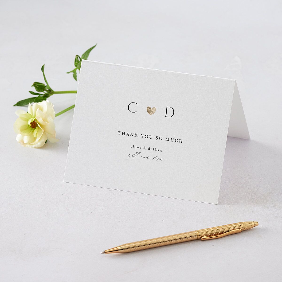 Your initials form a monogram united by a shining foil heart on this thank you card. The center of the card shows your simple words of gratitude in print, serif, and script typefaces.