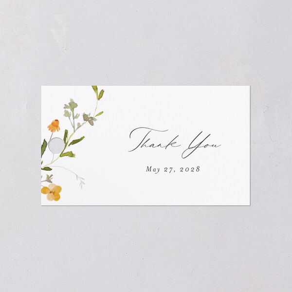 Dainty wildflowers tastefully adorn these favor gift tags along one side. The front displays “thank you” and your wedding date, while on the reverse, your personalized thank you message appears in italics.