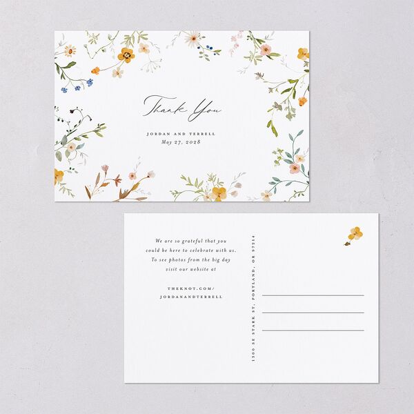 Dainty wildflowers weave a tapestry of elegance and charm on these thank you postcards. Within a floral frame, “thank you,” your names, and the wedding date flow across the page. On the reverse, there is space for your personalized thank you message.