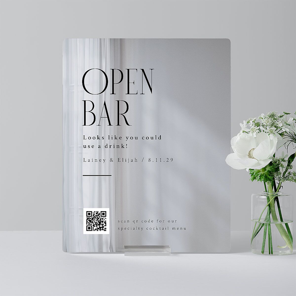 These bar tabletop signs take on an editorial identity of their own. Enlarged uppercase lettering highlights a special feature of your big day, accompanied by a QR code at the bottom left.