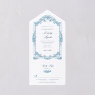 These antique all-in-one invitations will go hand in hand with your elegant wedding theme. A toile-inspired, illustrated frame encloses your day-of details, evocative of a flower-laden entrance gate. Romantic motifs weave throughout the card, from the delicate bouquet on the RSVP to the garden fountain cresting the delivery address. The combination of lavish cursive script and regal serif typography will tell your guests that they're in for the wedding of the social season.