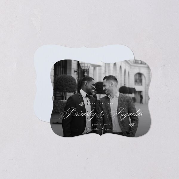 Personalize these elegantly understated petite save the dates with your favorite photo of you and your beloved. "Save the date" is outlined in a classic serif typeface over the image, and in sweeping calligraphy, your names loop across the center of the card. Below, your guests will find your wedding date and location.