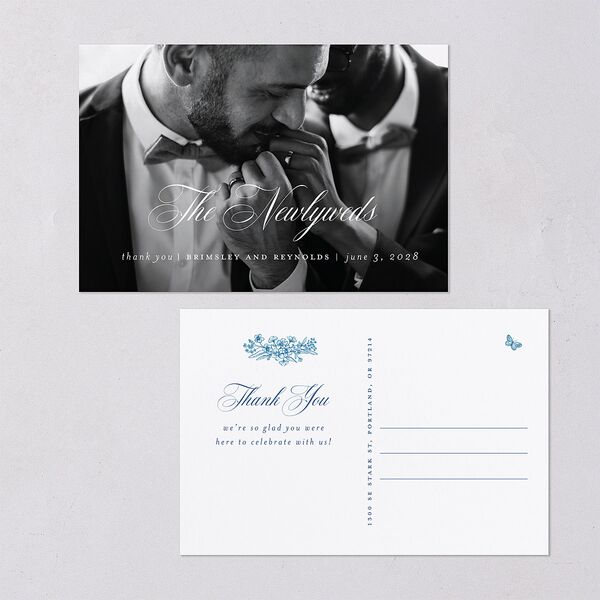 A photo of you and your beloved steals the spotlight on the front of these thank you postcards, inviting your friends and family to look back on your successful love match fondly. Your surnames unfurl across the front in a romantic cursive script just above your first names and wedding date. The back showcases your loving words in a traditional postcard format, with a toile-inspired floral illustration bringing together the design's Bridgerton aesthetic.