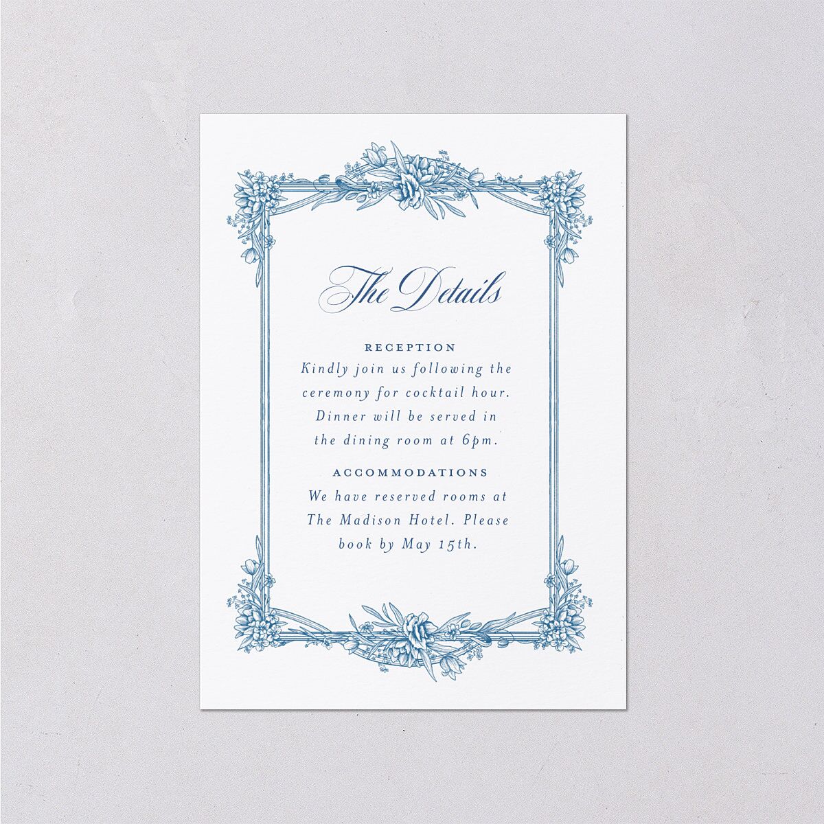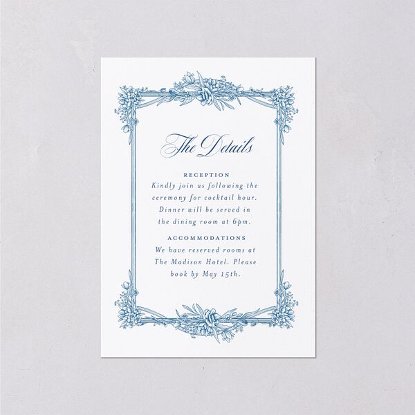 Wrap your wedding details up in plenty of vintage charm Lady Whistledown would approve of. These enclosure cards showcase a handsomely illustrated frame inspired by ancient wrought iron gates, with blooming flowers creating elegant Regency vibes. The words "The Details" sweep across the card in a dashing cursive script, followed by your day-of info in regal serif typography. With the minimalist color scheme and majestic linework, these cards will remind your guests that your wedding's going to define the social season.