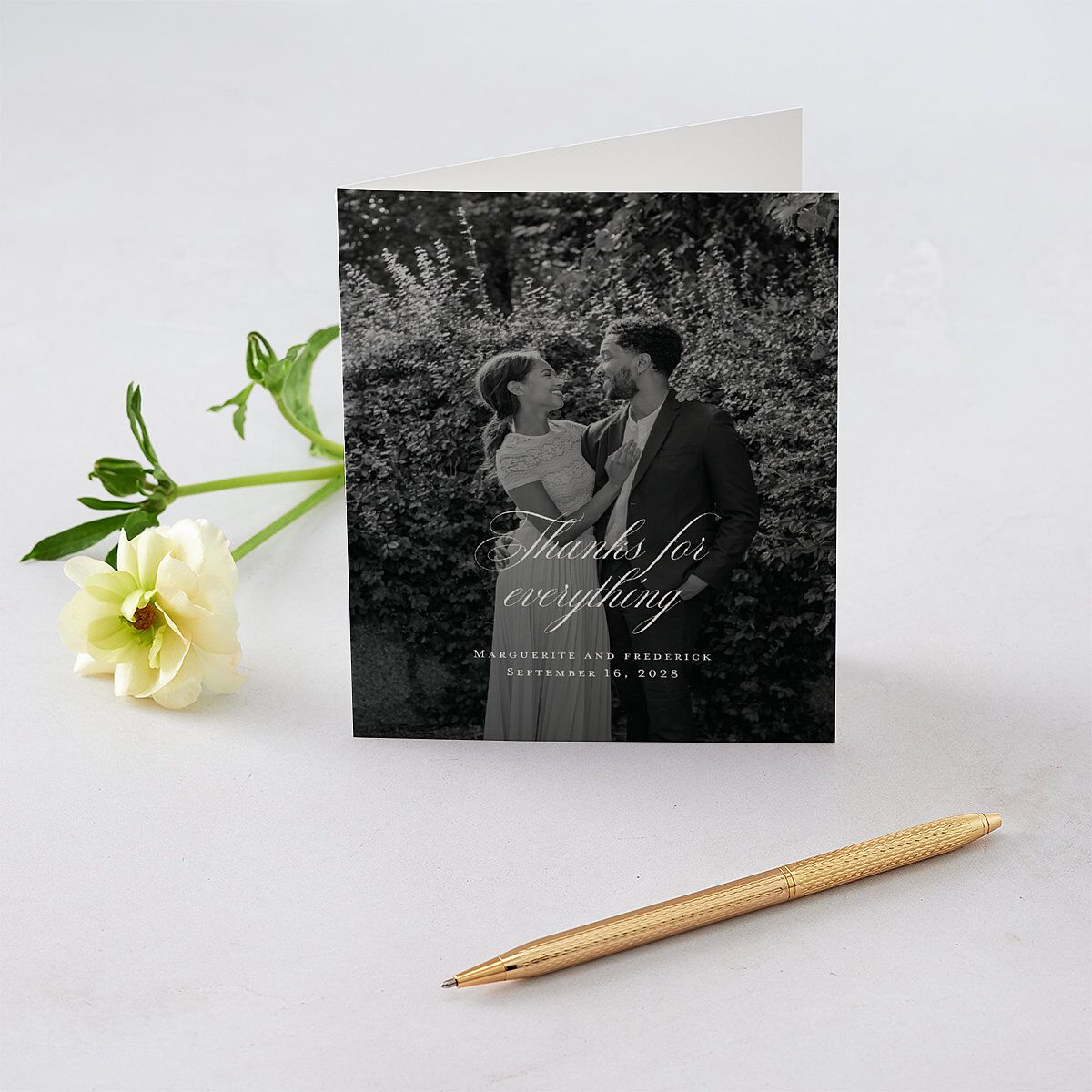Send your appreciation to your loved ones along with your unique sense of style using these personalized thank you cards. With an elegant snapshot of your love story as the backdrop, this card features your message of gratitude in a lavish script. Below, are your names and wedding date in a serif typeface.