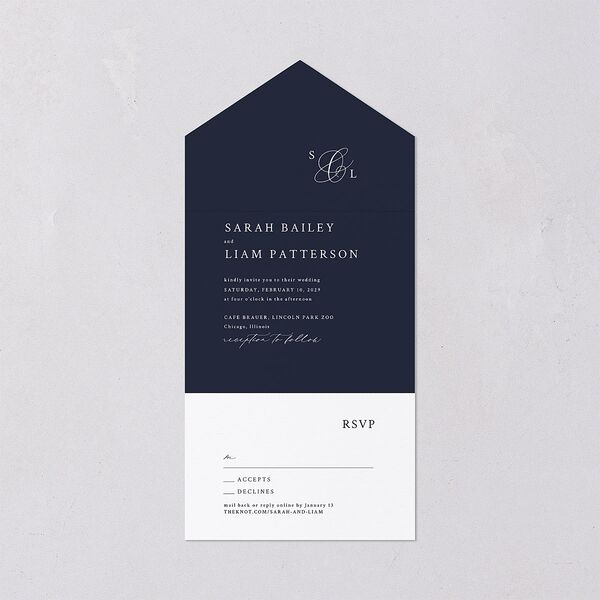 Dual tones of color play across these all-in-one wedding invitations, bringing contrast in an otherwise simple design. The typography-forward layout features predominantly serif lettering, with subtle touches of cursive throughout, all unified beneath your personal monogram framed by a swirling ampersand motif.
