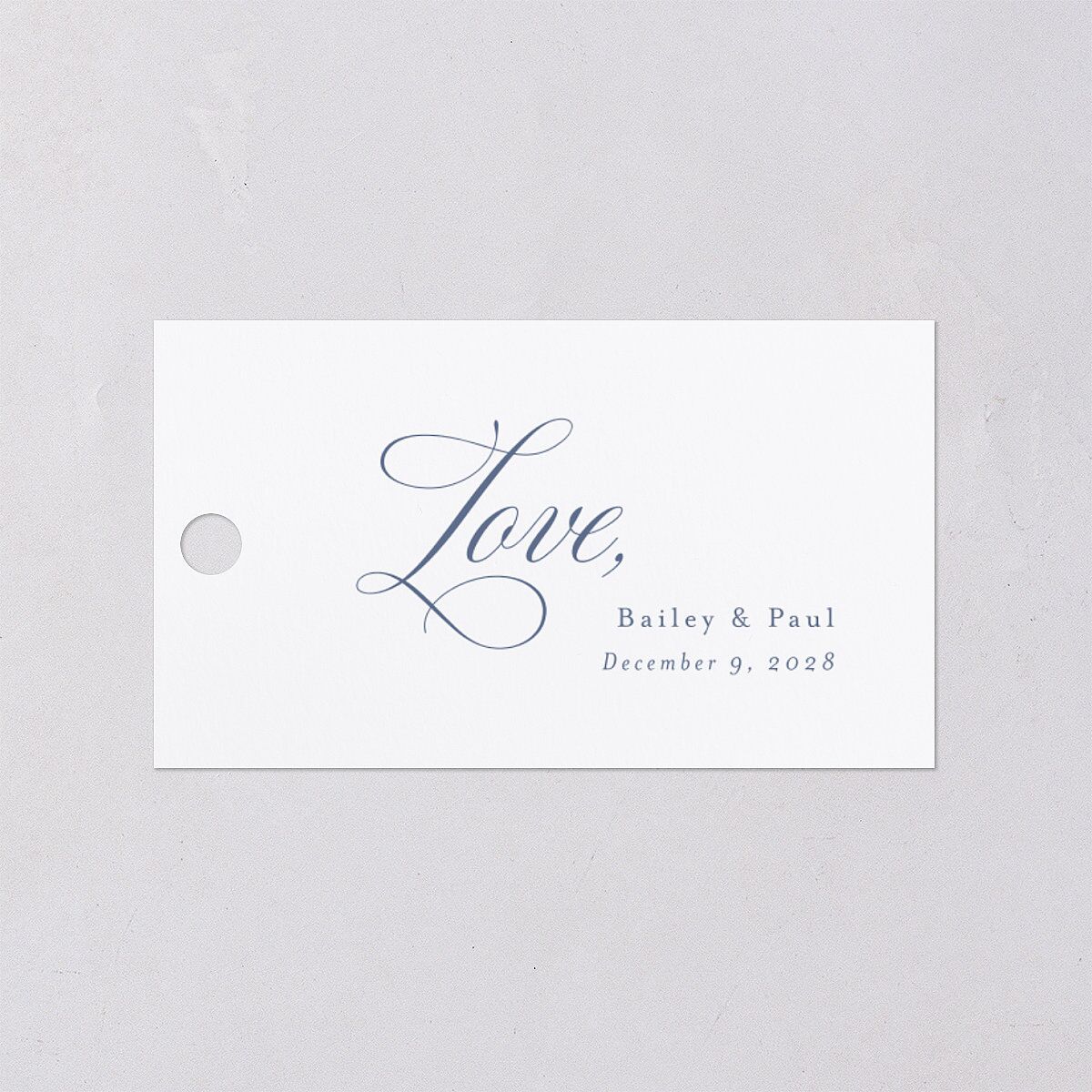 One side of these favor gift tags features the word "Love," in romantic script with names and wedding date in the bottom-right corner. The back shows a message of thanks to express your eternal gratitude.