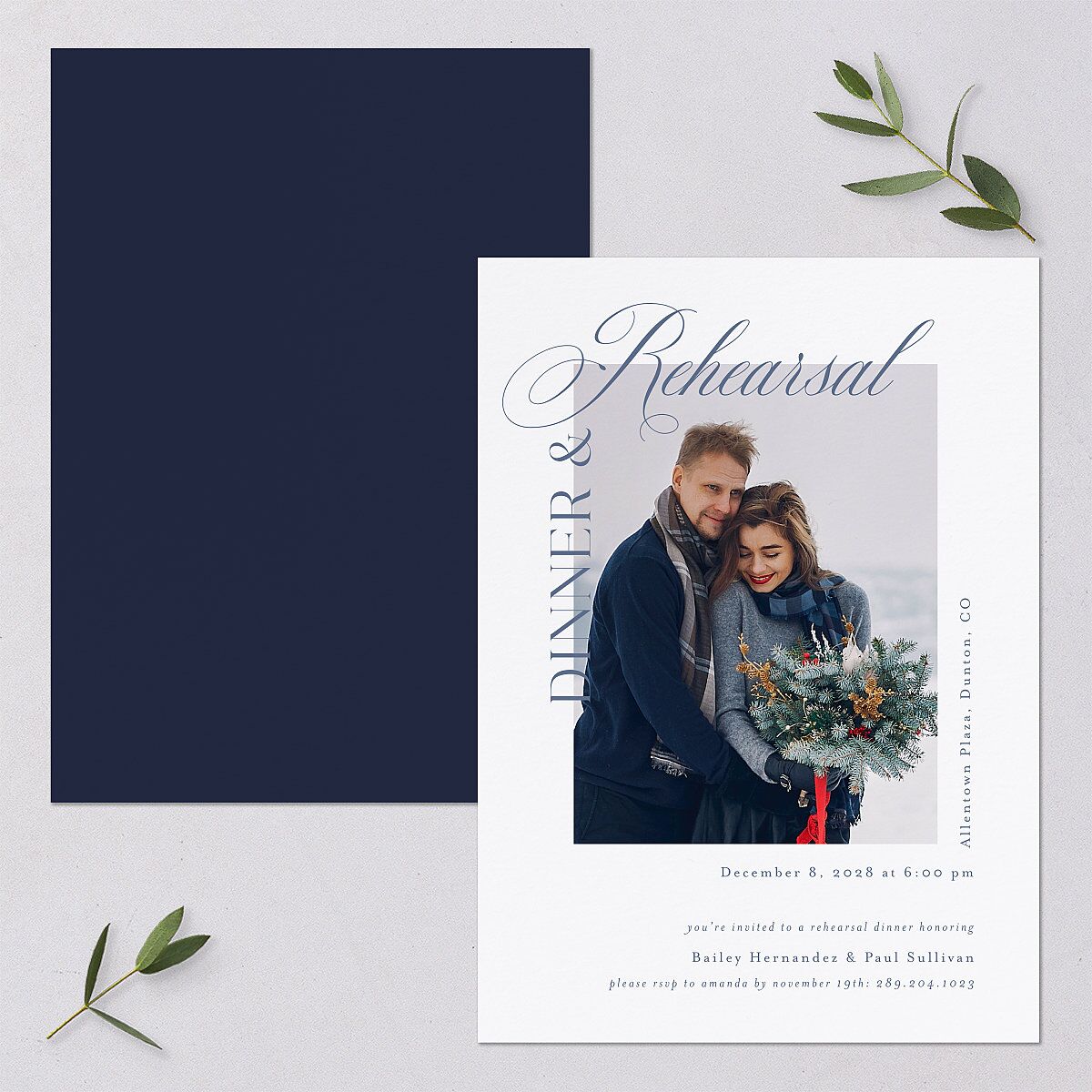 Honor your eternal love even before the big day. The front of these elegant rehearsal dinner invitations feature a couple's selected photo and the words "Dinner & rehearsal." The bottom-right shows their message, names, event date, and venue, along with RSVP details.