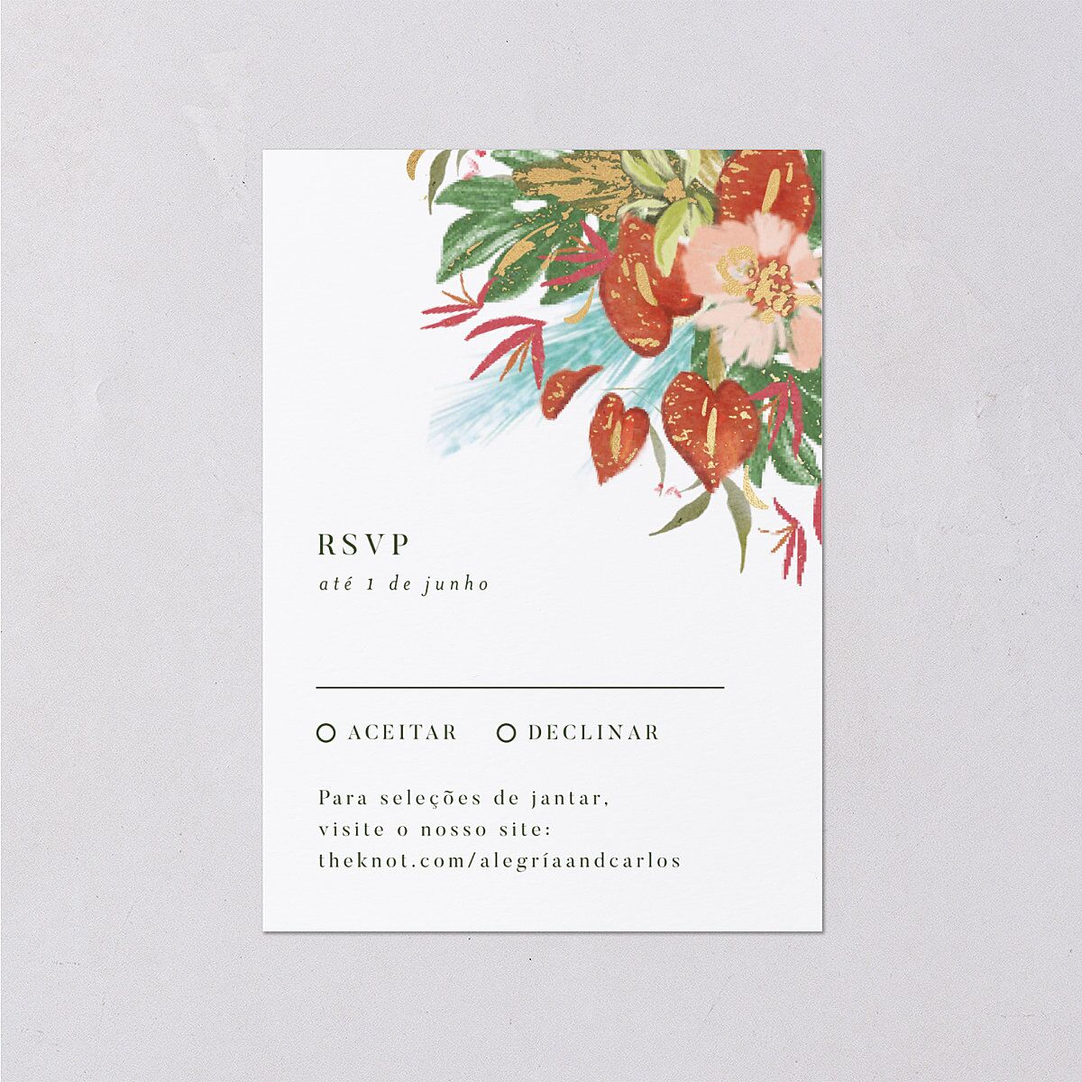 Help you guests feel excited to escape to your wedding! Lush brushstrokes and gilded foil accents are enhanced by the rich color palette of these wedding response cards. The tropical floral illustration is paired with a simple serif typography, showing balance and a sense of sophistication.
