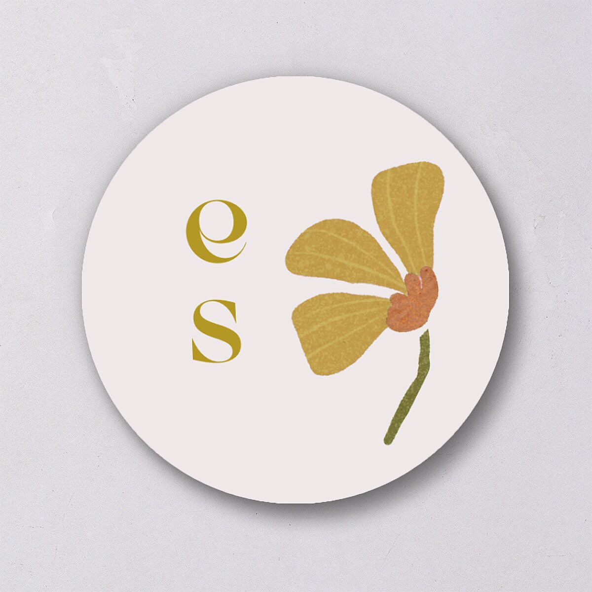 Evoke a vintage feel with this wedding sticker, adorned in what appears to be a single-pressed flower. Your initials sit neatly alongside, their retro style contrasting beautifully against the pastel background.