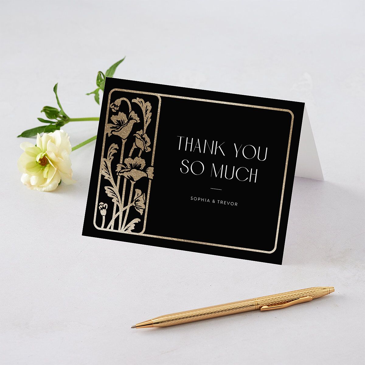 Gilded with flourishing flowers, your thank-you cards are romantic and full of gratitude. Your thank-you cards display your title and names in a thin cinematic script inside a chic foil frame.
