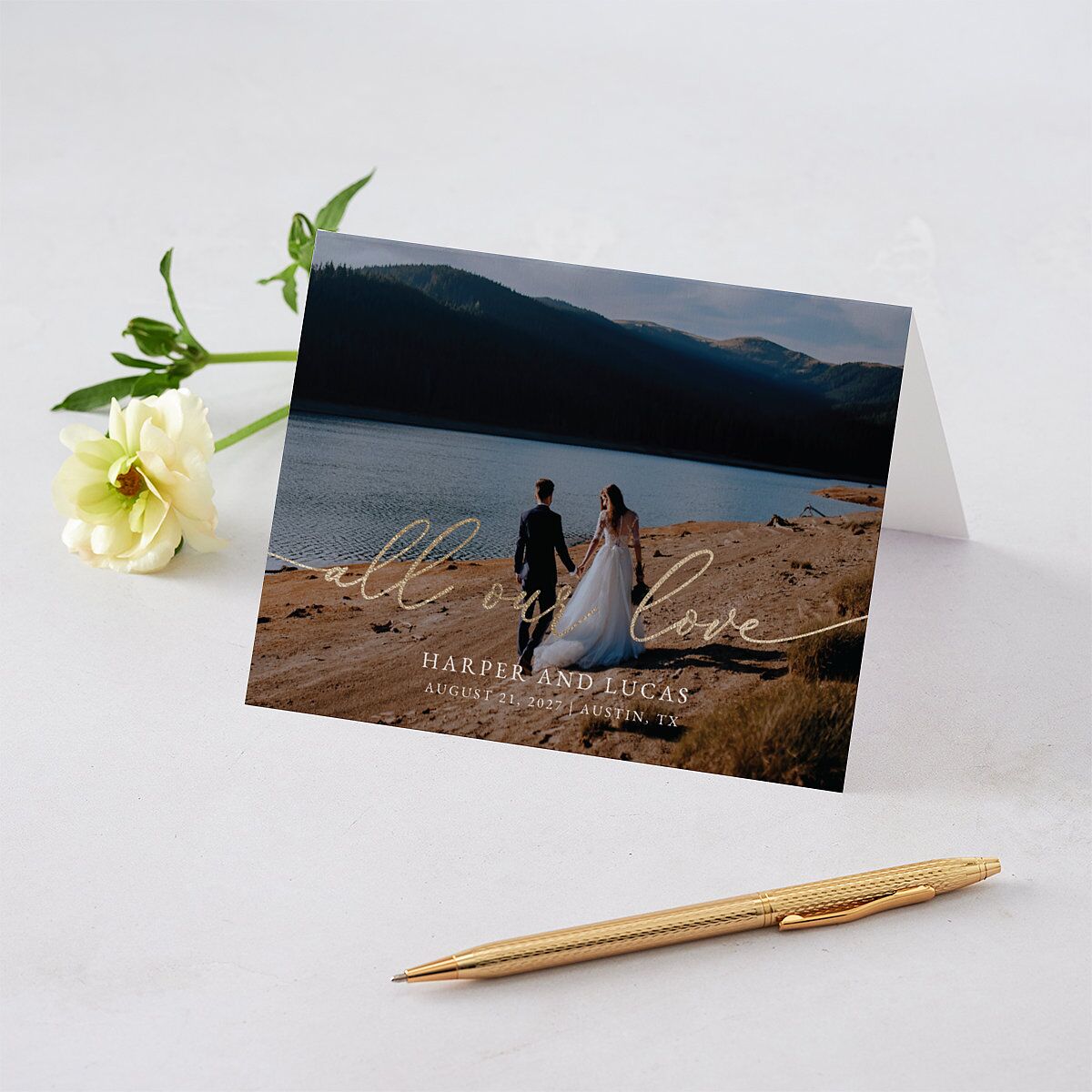 On this modern thank you card, a gilded script message of all your love sweeps across a photo of your choice. At the bottom, your names, wedding date, and wedding location are outlined in a monospace serif font.