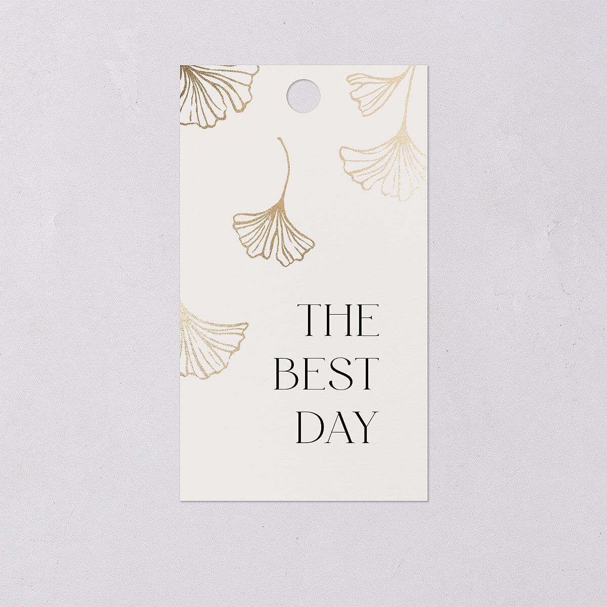 Leave a positive lasting impression with favor gift tags featuring the words "The Best Day" beneath a shower of shimmering ginkgo leaves. There is space on the back for a personal message of gratitude, accompanied by your names and event date.