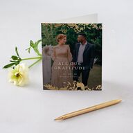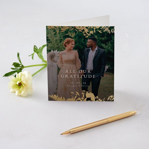 Showcase your gratitude with plenty of glistening glamour. Your favorite wedding photo takes center stage on your thank-you cards, overlaid with a silhouetted, garden-inspired frame. In the card center are the words "all our gratitude" in a sophisticated serif typography.