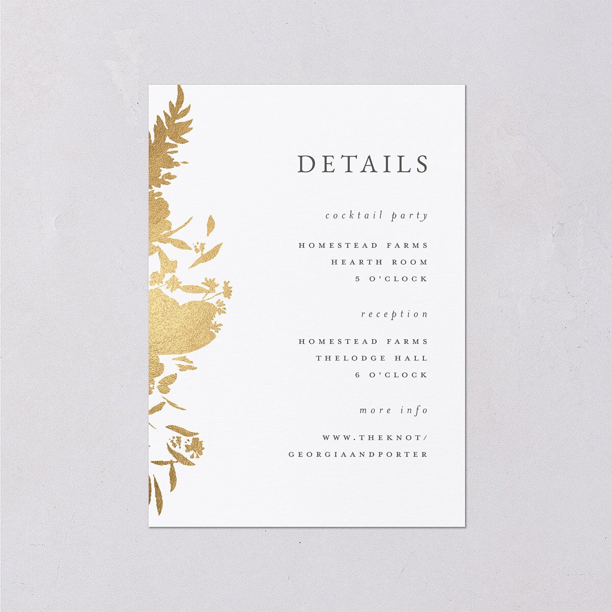 The details of your big day deserve a glistening finish. With the foil silhouette of garden flowers and greenery, your enclosure cards will catch your guests' attention and make sure they don't miss a thing. Your day of-info is listed on the front, elegantly aligned to the right, while the back displays a link to your wedding website.