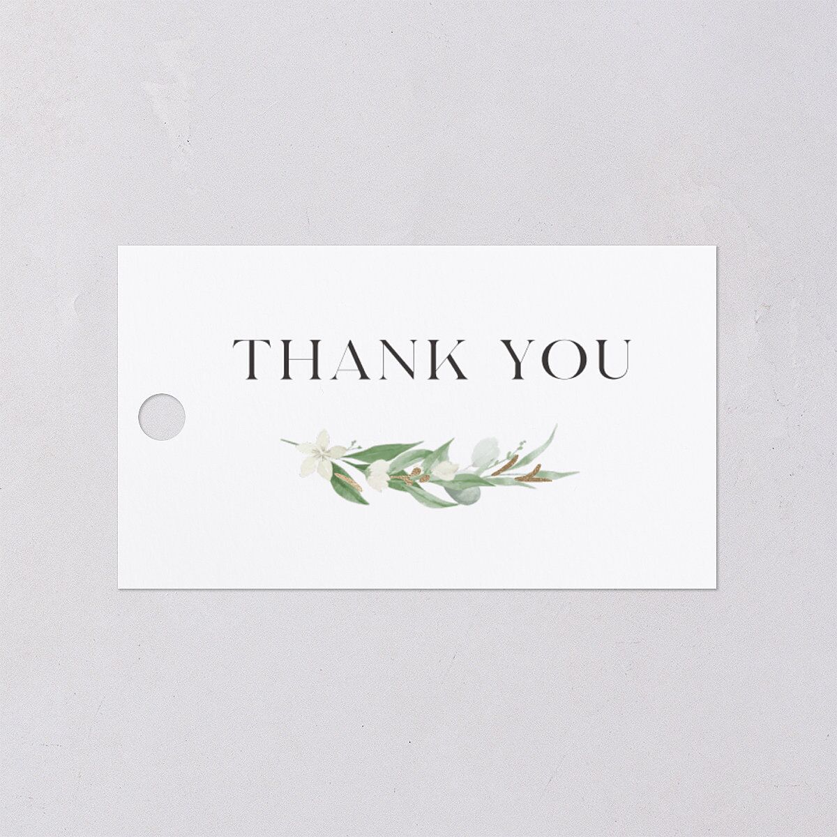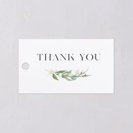 Traditional serif typography rests gracefully atop an evenly toned backdrop on your favor gift tags, with centered text that expresses your gratitude in its purest form. Beneath, a delicate watercolor laurel branch adds a soft botanical touch. Flip the tag to reveal a more personal message of thanks, offering your loved ones a warm note as they unwrap their wedding favors.