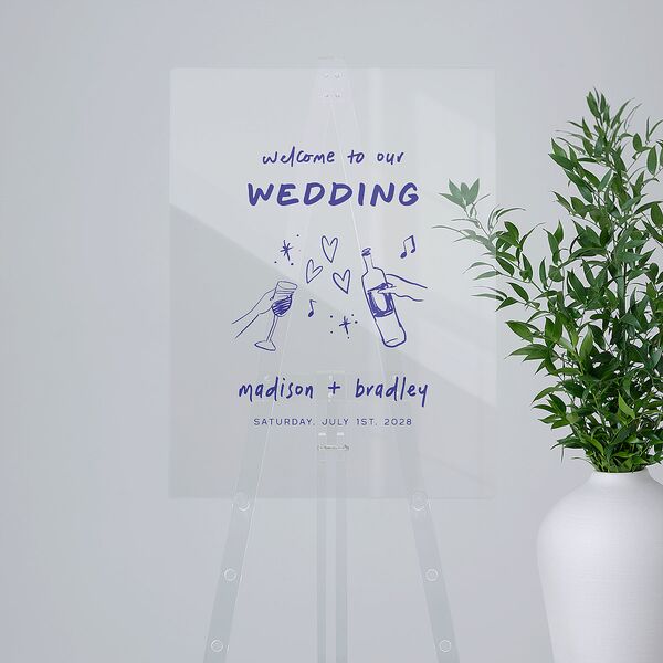 Pop the champagne and cue the music—these welcome signs set the tone for a celebration filled with love and laughter! A heartfelt greeting to guests is presented in a charming hand-lettered script, followed by whimsical hand-drawn illustrations of clinking glasses, a wine bottle, and scattered musical notes and hearts. Your names and wedding date appear below, grounding the design with a touch of personalization.