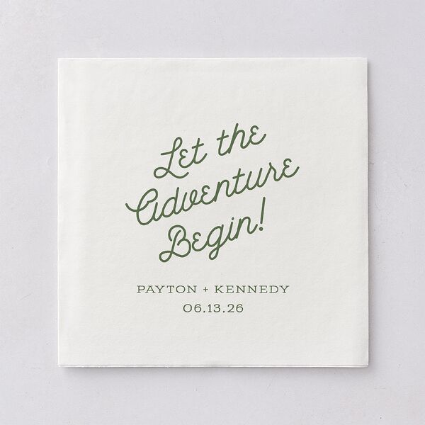 A call to celebrate your new adventure crowns these charming luncheon napkins in playful script-style typography. Your names and wedding date appear below in a typewriter-inspired serif font for a touch of personalization.