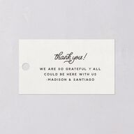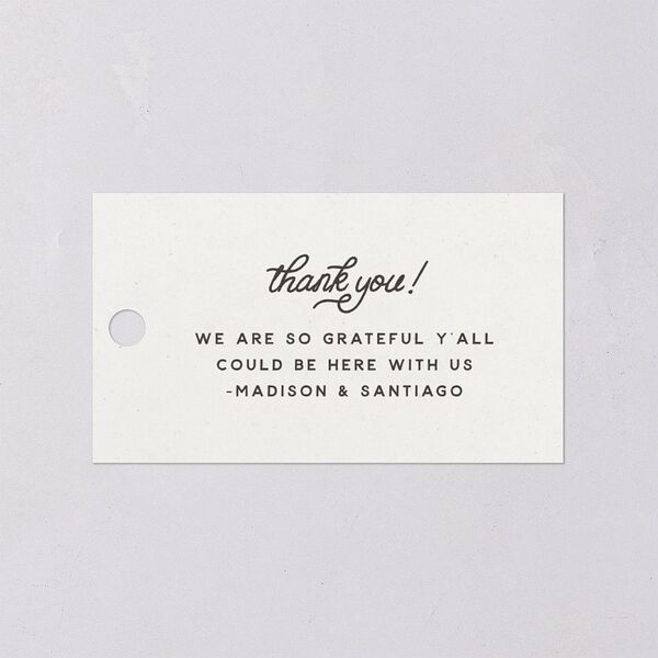 Looping script spells “thank you!” on these Texas-esque favor gift tags. The back features your wedding date along highlighted by a horseshoe design.