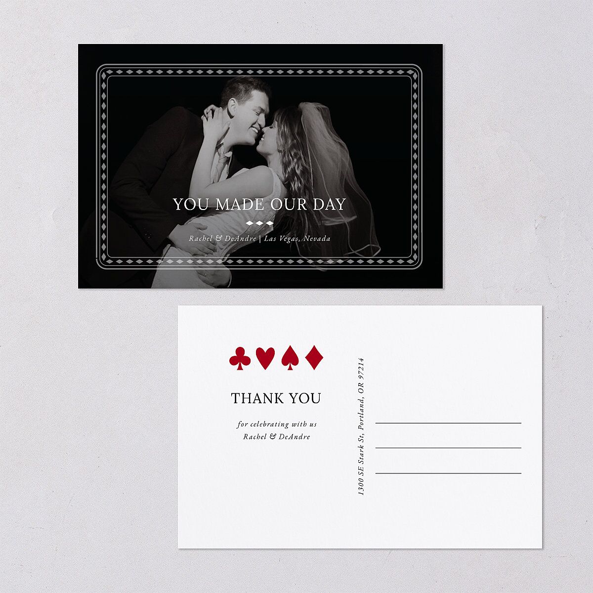 The front of each thank you postcard shows a photograph of your choice as the backdrop framed by a playing card-style border. Over the top are the words "you made our day," your names, and your wedding venue. The back features the four suit symbols, a message of thanks, and space for a mailing address.