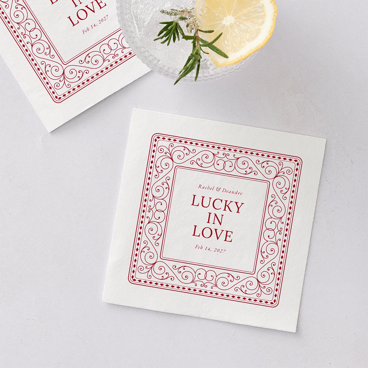 An ornate border resembling that of a playing card frames these playful cocktail napkins. Your names, followed by “lucky in love” and your wedding date appear in a charming serif typeface.