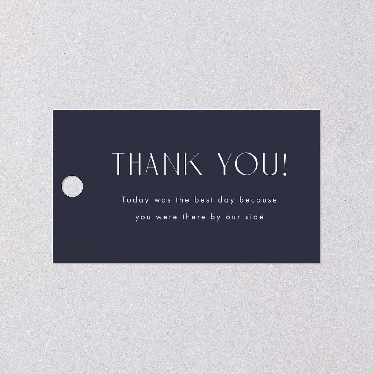 One side of your favor gift tags shows the initials of your first names. The other side shows the words "Thank you!" and your message of thanks.
