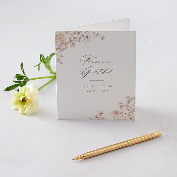 Show your loved ones your gratitude with a touch of timeless luxury. The front of your thank you card states "Forever Grateful" in flowing script above your names and wedding date, which are printed in a classic serif font. In the corners, lush floral illustrations evoke your blossoming love.