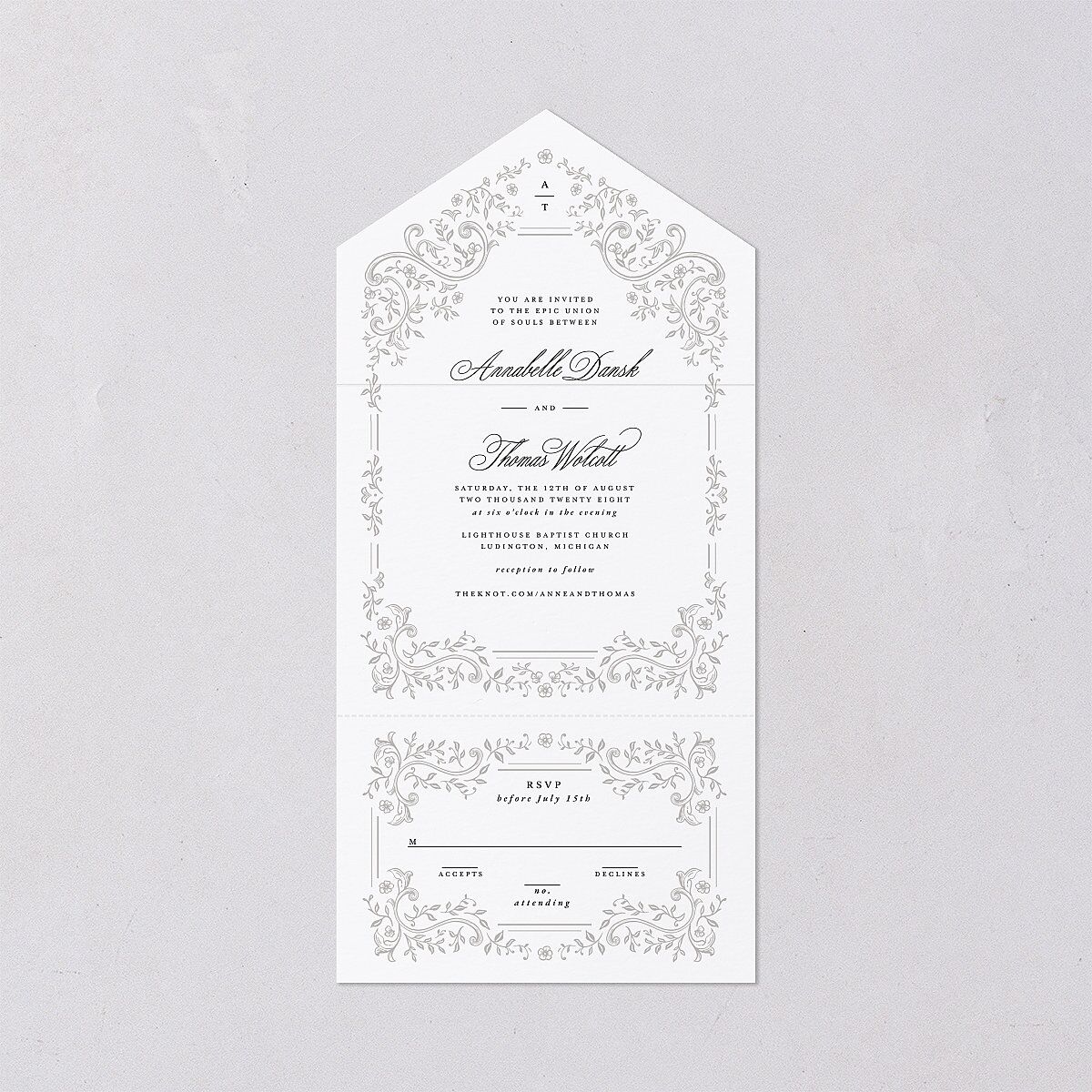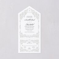 Luxe, foil-kissed greenery, reminiscent of antique lace garments, unfurls around our all-in-one wedding invitations. The gilded foliage flourishes around your personal monogram and formal announcement. Your names, rendered in elegant calligraphy, become the focal point within this romantic Gothic garden.
