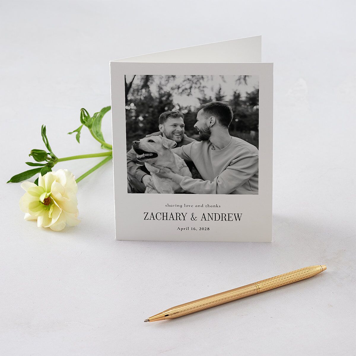 Send a heartfelt token of appreciation with these wedding thank you cards. Adorned with a sweet photo of you and your spouse, each card offers a small yet meaningful memento of your gratitude. A black and white image adds timeless charm above a modern typeface message, while your custom monogram and wedding date grace the reverse for a finishing touch.