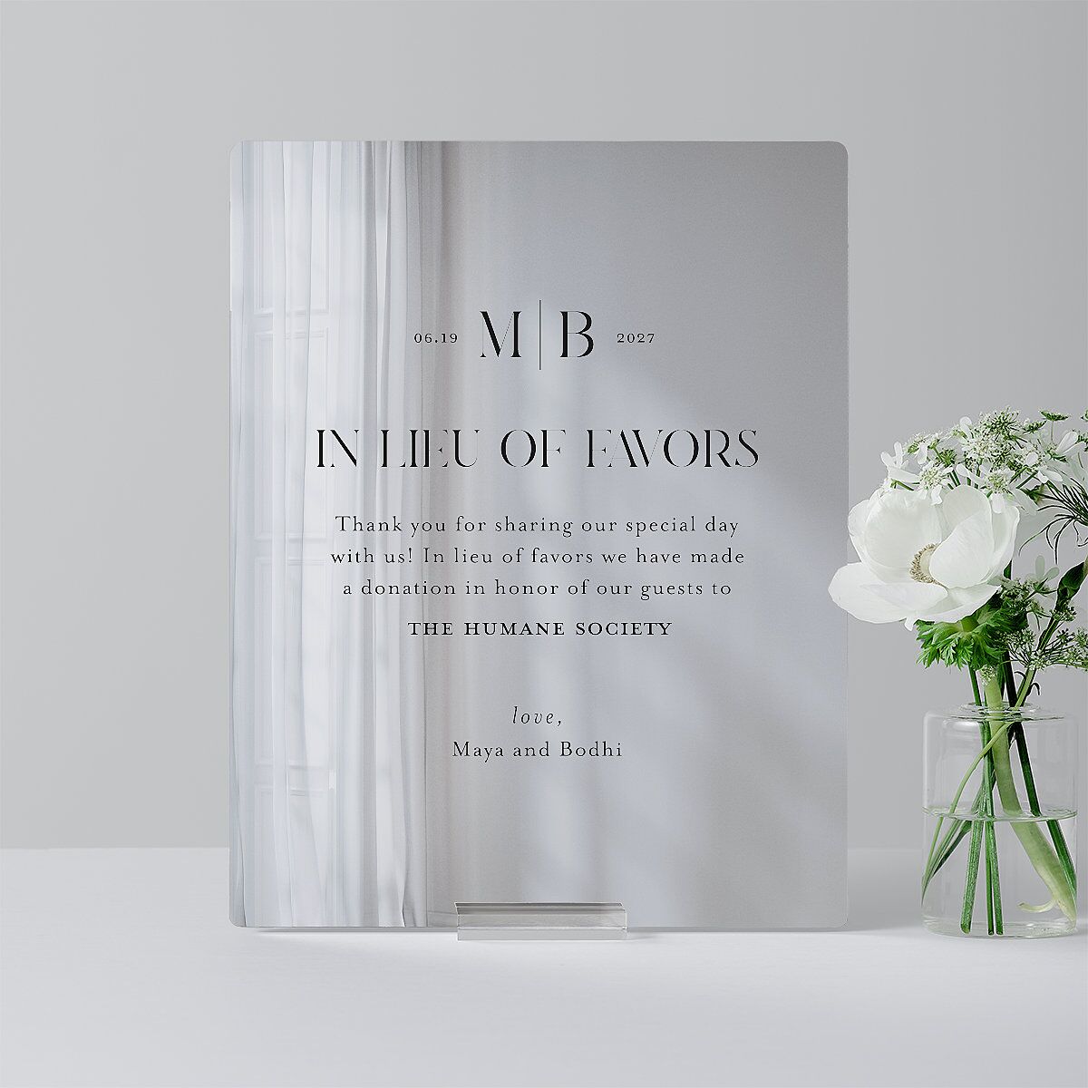 Like a signature stamp of love, these favor tabletop signs showcase your monogram in a stylish, personalized design. A structured serif font keeps the text crisp and clear, while elegant spacing creates a balanced composition. Thoughtful yet understated, this design brings a timeless touch to your wedding decor.