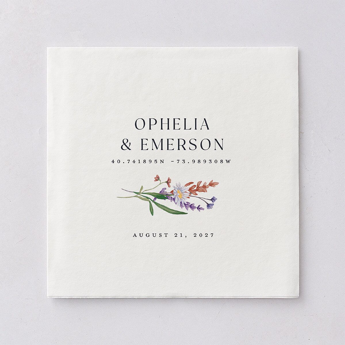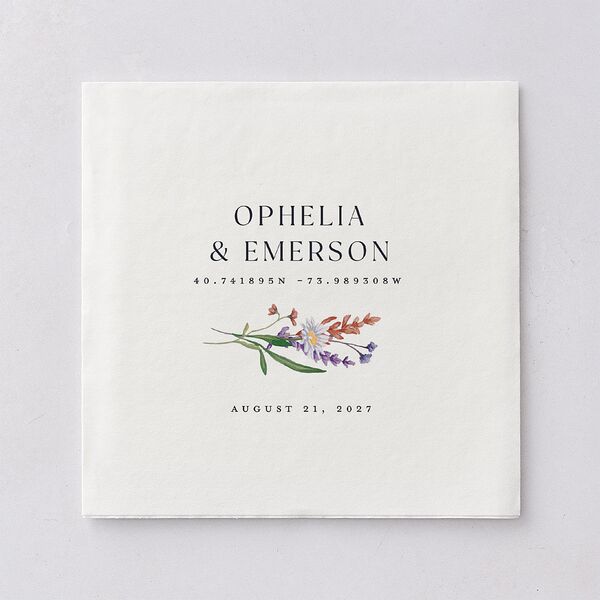 A crisp serif font elegantly displays your names, making a bold statement on these luncheon napkins. Each one is thoughtfully adorned with your wedding date and your location’s GPS coordinates, adding an adventurous touch to your celebration. To complete the design, a wildflower motif is included, bringing an outdoorsy charm to the overall look.