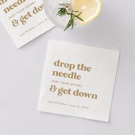 The records are spinning, the drinks are poured, and it's time to hit the dance floor. These contemporary cocktail napkins feature playful typography that reads, "drop the needle (not your drink) and get down."