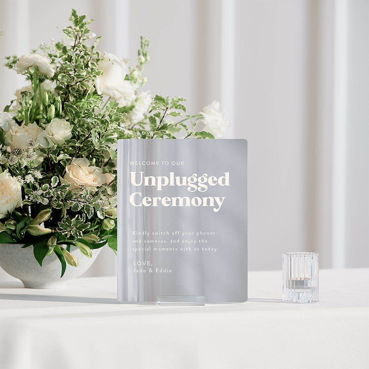 Designed like a "Now Playing" list, these menu tabletop signs celebrate your love story with a creative layout designed to mimic your own personal playlist. Your shared monogram rests in the corner, while bold serif lettering highlights each moment, paired with softer details that keep the look timeless.