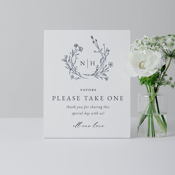 These understated bended signs will look fabulous atop your reception tables. Classic serif typography is set against a clean backdrop, complemented by a handwritten-style message below. Your custom monogram is framed by a delicate, flower-pressed border of inky blossoms swirling in graceful motion.