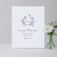 These understated favor tabletop signs will look fabulous atop your reception tables. Classic serif typography is set against a clean backdrop, complemented by a handwritten-style message below. Your custom monogram is framed by a delicate, flower-pressed border of inky blossoms swirling in graceful motion.