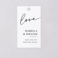 "Love" sweeps across the front of this gift tag in a tasteful script, with your names and wedding date appearing below it in a timeless serif font. The reverse has a message of gratitude for your guests, letting them know that nothing they've done for you has gone unappreciated.